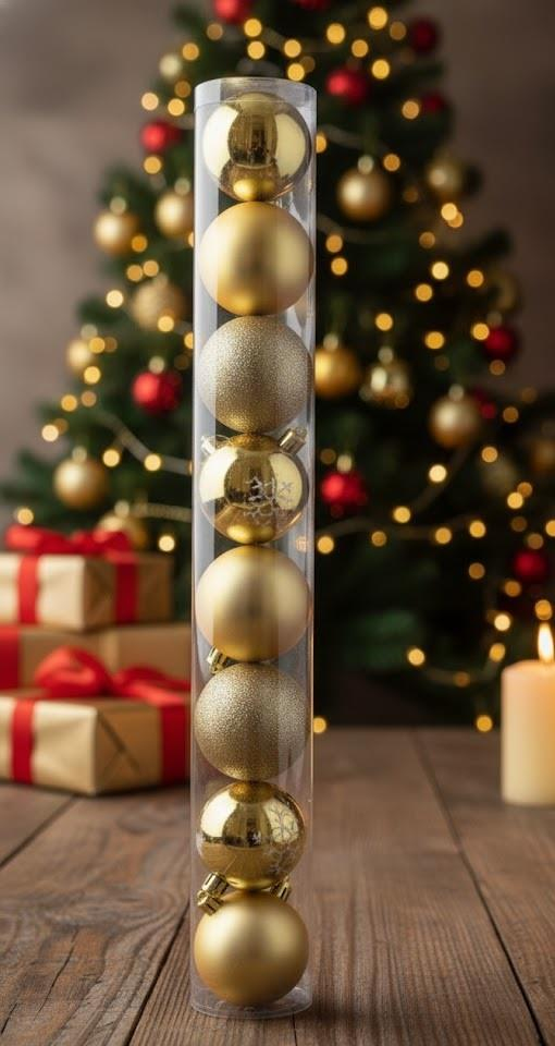 ERT-YIL-25308-GLD YILBAŞI TOP KIRMIZI SİMLİ PARLAK MAT 6 CM 8 ADET PVC SİLİNDİR