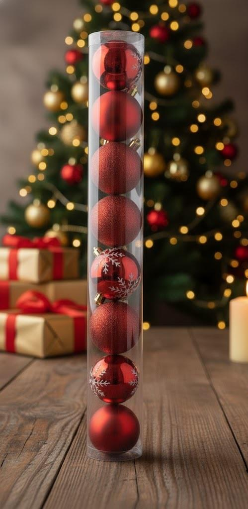 ERT-YIL-25308-KRMZ YILBAŞI TOP KIRMIZI SİMLİ PARLAK MAT 6 CM 8 ADET PVC SİLİNDİR